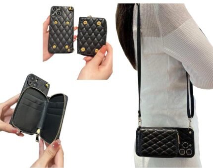 ZONOI Luxury Designer iPhone 14 Pro Cover with Crossbody Chain Cute Mobile Phone Case for Girls Women’s Stylish Wallet with Card Holder Sling Purse Bag Back Case Lanyard Strap