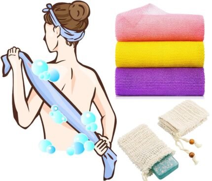 JICOOT African Net Sponge( 2 Pack) & Soap Exfoliating Bag( 2 Pack), Authentic, Real, Exfoliating Bath Wash Cloth, Long Sponge, Body Exfoliator, Shower Bath Accessories, Back Foot Scalp Scrub, Flat Dead Skin Remover
