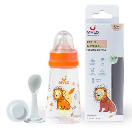 Mylo Baby 2 in 1 Feeding Bottle with Spoon (125 ml) for New Born Baby | Anti Colic & BPA Free Feeding Bottles | Feels Natural Baby Bottle | Easy Flow Neck Design- Orange Lion