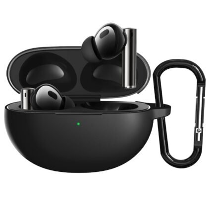 Sounce Silicone Case Cover for Realme Buds Air 5 Pro, Portable Non-Slip Grip & Scratch-Resistant Protector with Carabiner Clip Full Protection Water Resistant, Shockproof Cover – Black