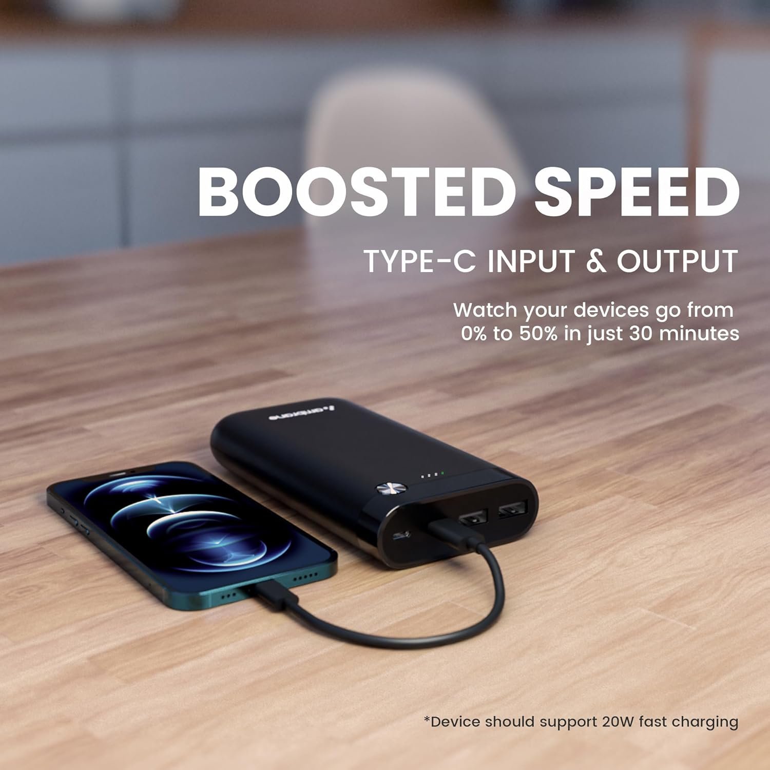20W Fast Charging Output- Powerful 20W PD output for exhilarating charging speed, there to favour you during an emergency. For instance, it can bring your new iPhone or Android device back to 50% in as quickly as 30 minutes.
