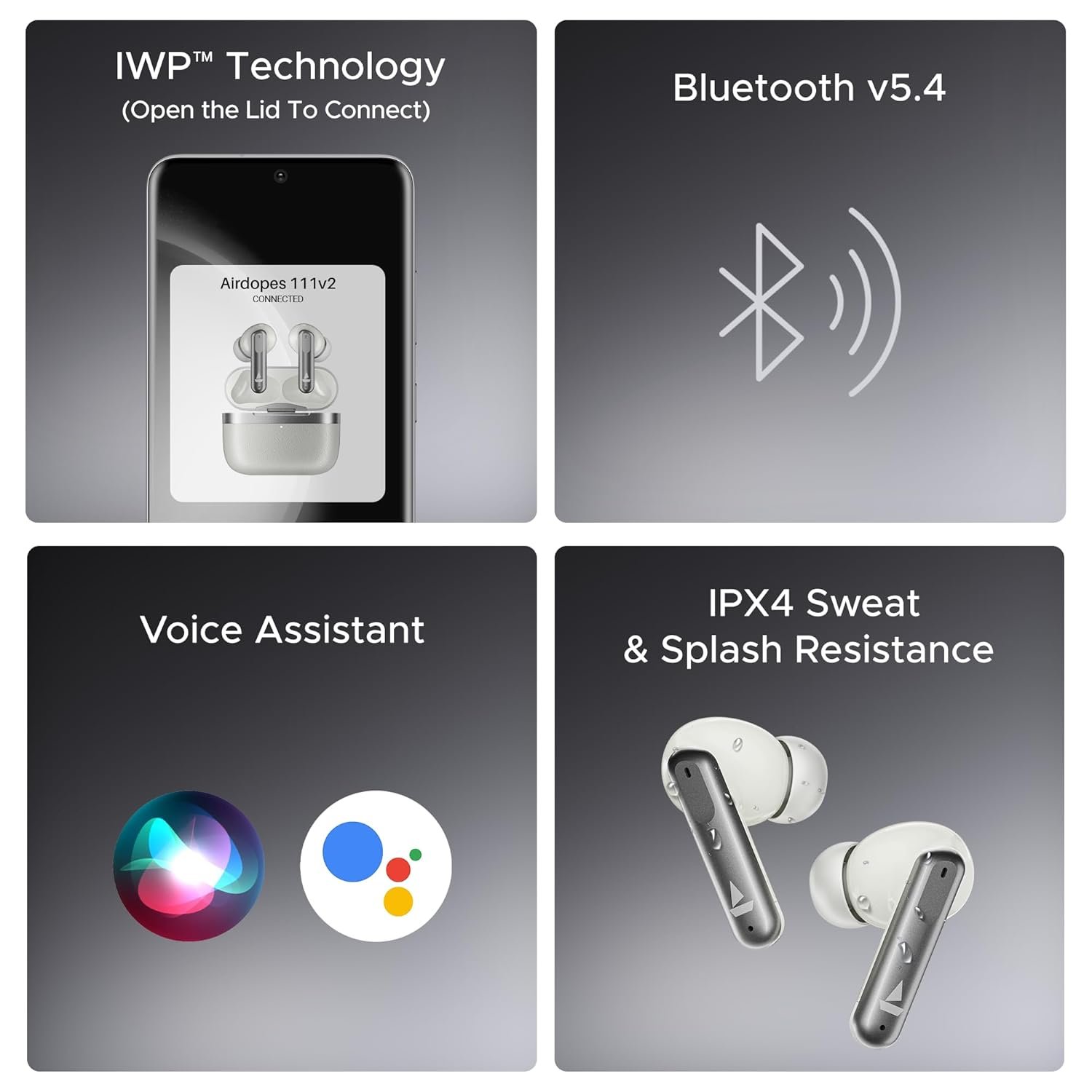 Quad Mics with ENx Technology: Enjoy calls with high clarity indoors or on the go with the boAt Airdopes 111v2 TWS Earbuds. ENx-powered quad mics cancel background noise so you wonโt have to search for a quiet spot.