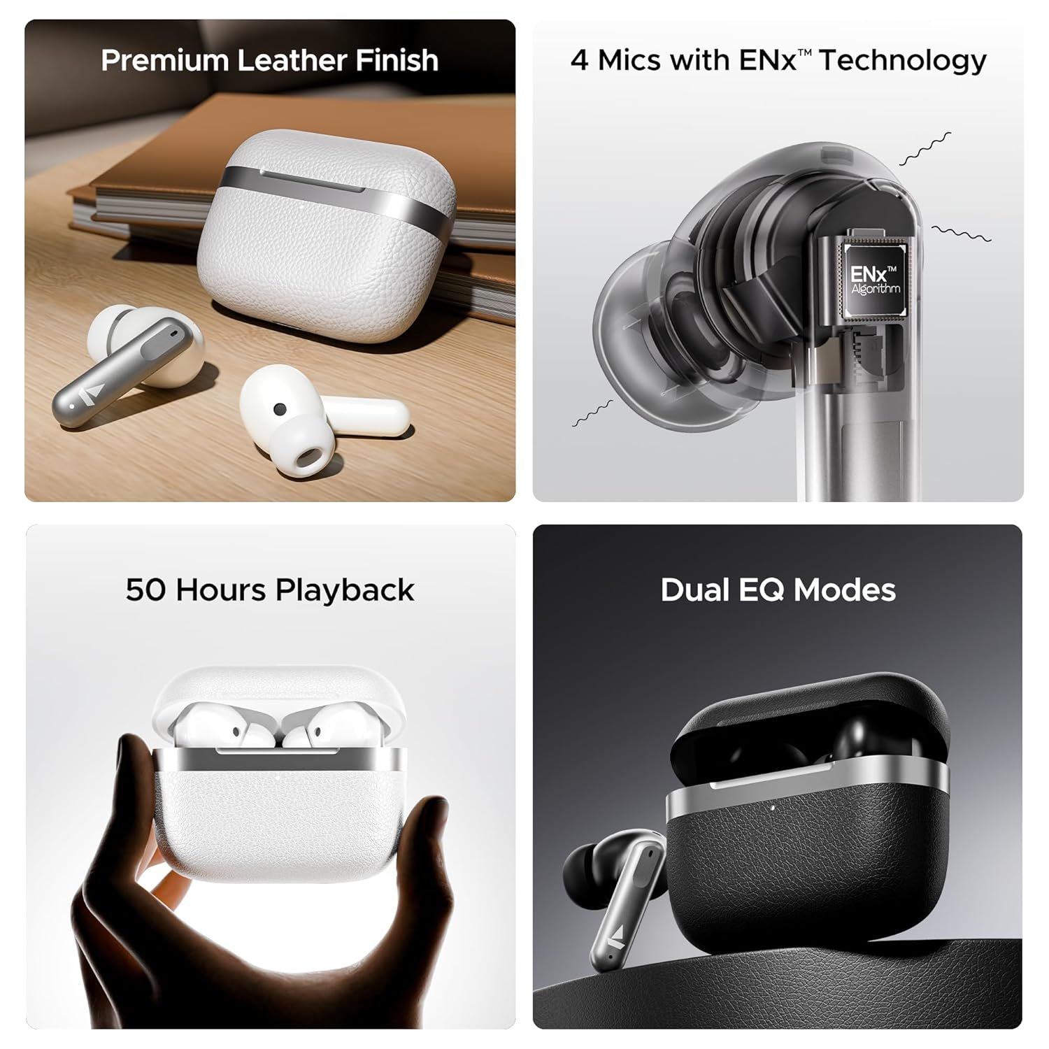 boAt Airdopes 111v2, Premium Leather Finish, 4Mics ENx, 50HRS Battery, 13mm Drivers, Fast Charge, Dual Pair, v5.4 Bluetooth Earbuds, TWS Ear Buds Wireless Earphones with mic (Ivory White)