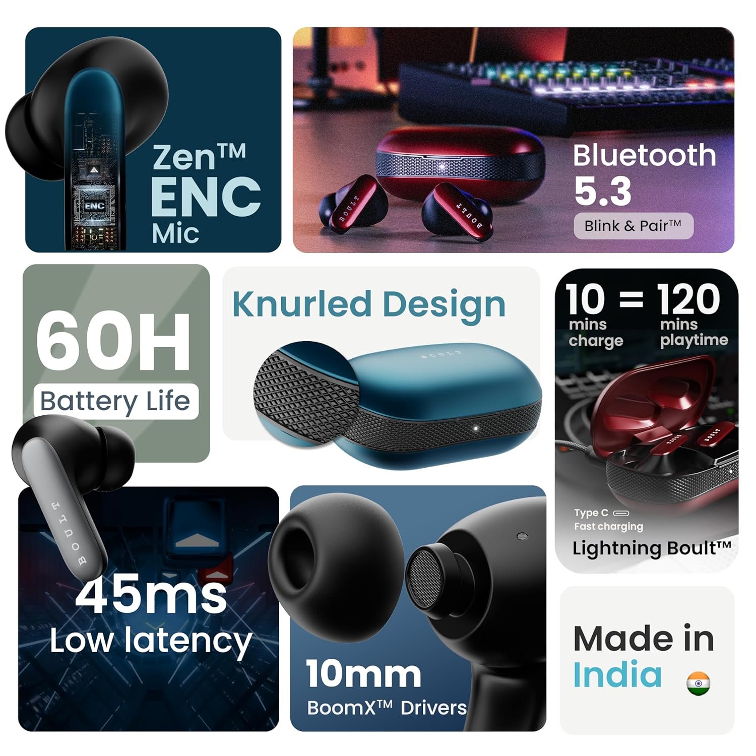 Boult Audio Z20 Pro Truly Wireless Bluetooth Ear buds with 60 Hours Playtime, 4 Mics Clear Calling, Made in India, 45ms Low Latency, Rich Bass Drivers, IPX5, TWS earbuds bluetooth wireless (Jet Black)