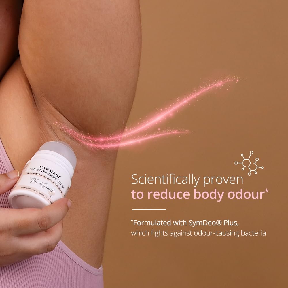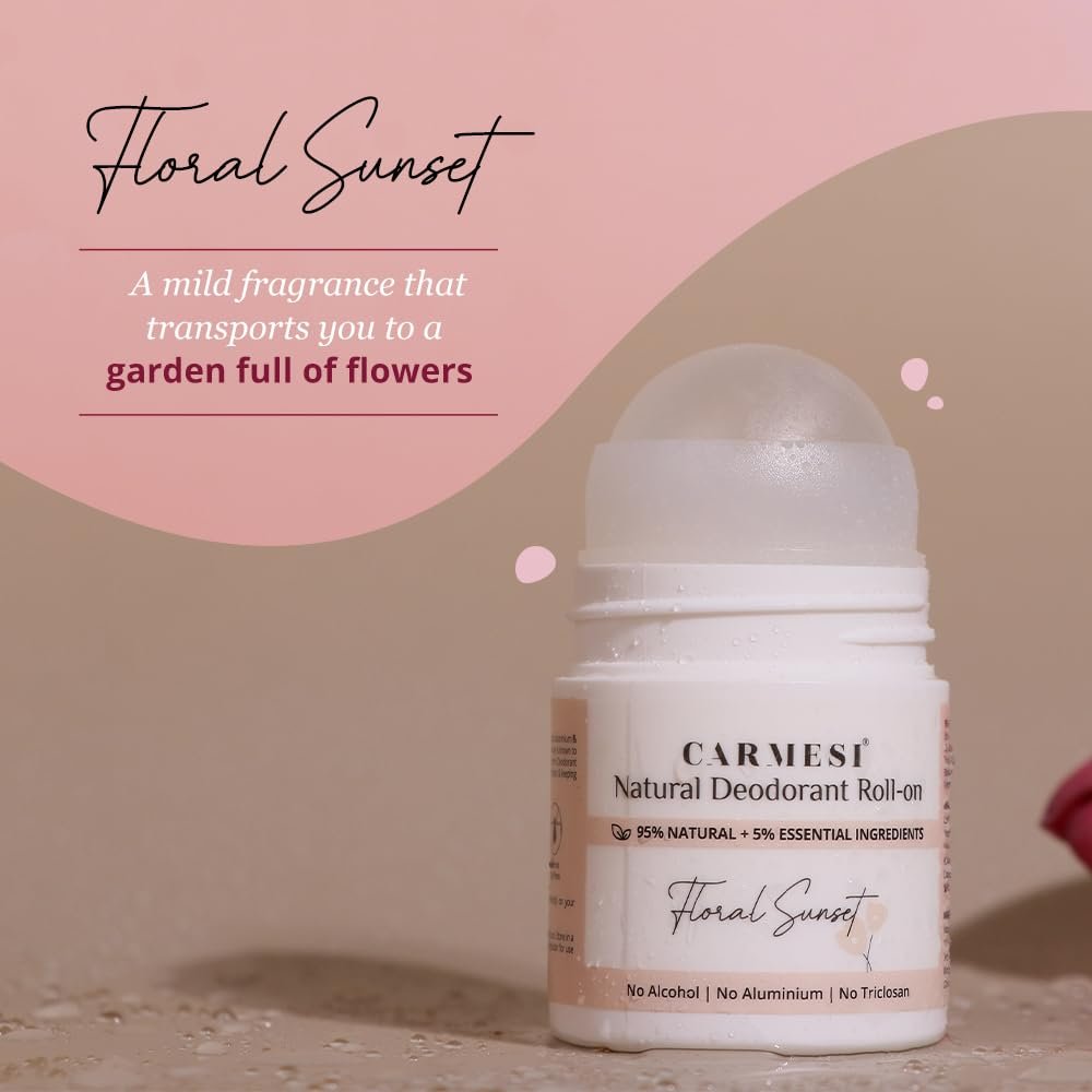 Carmesi Natural Underarm Roll On Deodorant for Women | 95% Natural + 5% Essential Ingredients | For Fresh Underarms All Day | No Alcohol & Aluminium | Floral Sunset | 50 ml