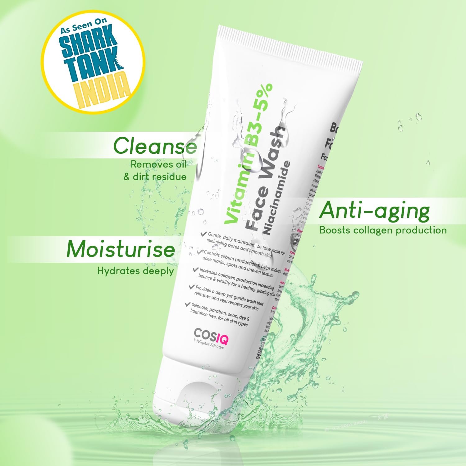 Cos-IQ Vitamin B3-5% Niacinamide Face Wash for Smooth and Even Skin, Tan Removal & Glowing Skin, pH Balanced & Paraben Free (30 Days Pack, 100ml)