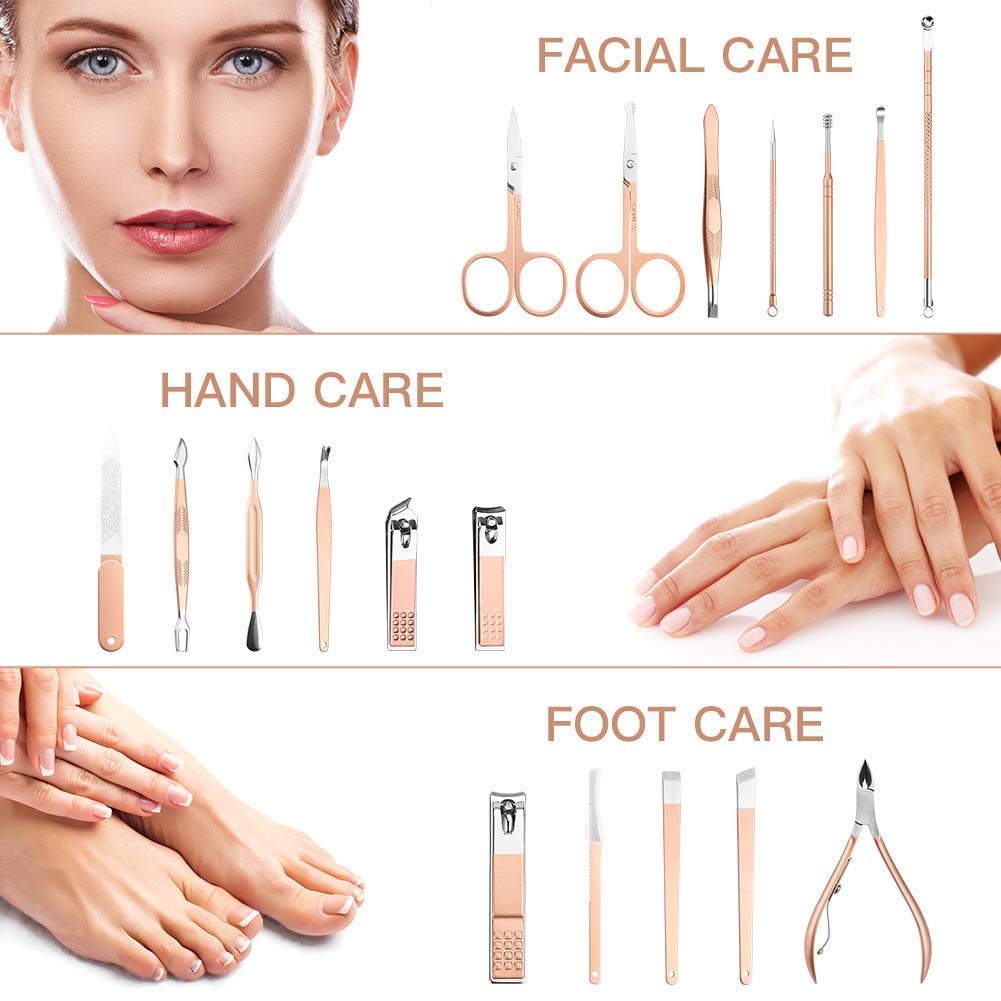 PROFESSIONAL -Manicure Kit contain 18 pieces of nail and toenail tools. It can satisfy almost all of your facial, hand and foot care,manicuring,pedicuring,Ear picking,eyebrow shaping, anti-acne, exfoliating Etc. It is perfect for all types of nails and trims, including women,men,girls,boys and seniors.