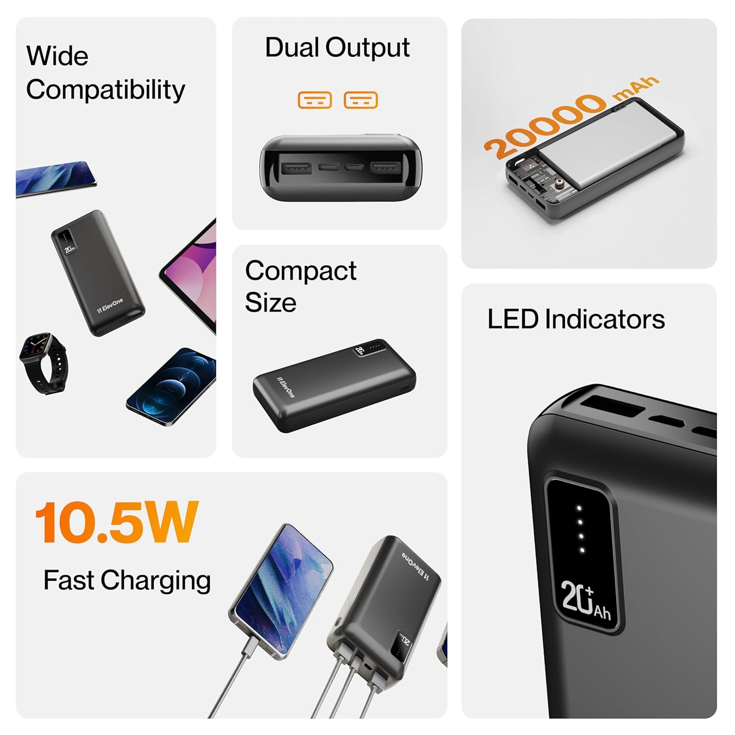 ElevOne by Ambrane 20000mAh Power Bank with 10.5W Fast Charging, Dual USB Output, Made in India, Multi-Layer Protection, Wide Compatibility, Stylish & Compact Design + Type-C Cable (Rapid 20, Black)
