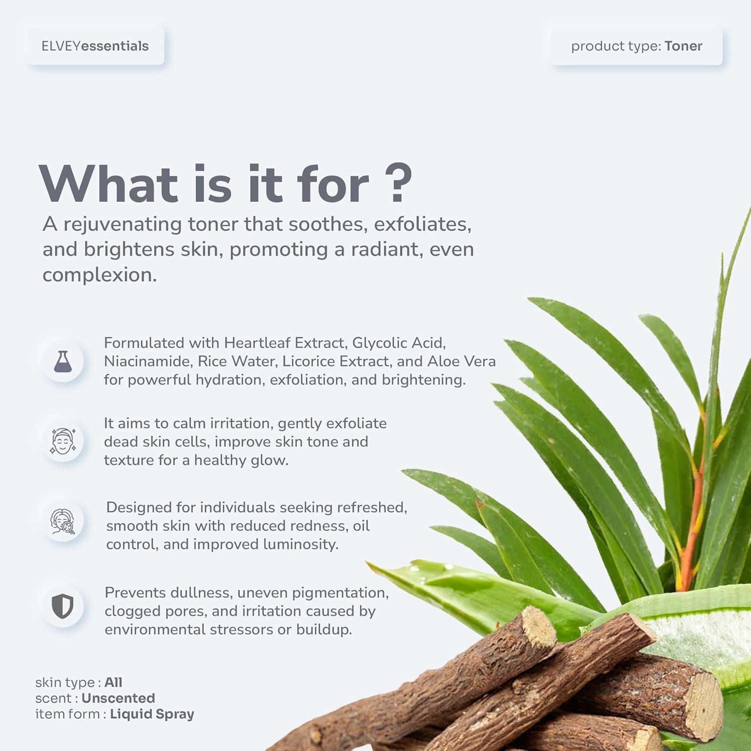 Elvey Essentials Glo Brightening Face Toner | 11% Heartleaf Extract, 5% Niacinamide & 8% Glycolic Acid With Rice Water | Tightens Pores, Fades Blemishes & Exfoliates Skin | Alcohol & Fragrance Free – 150ml