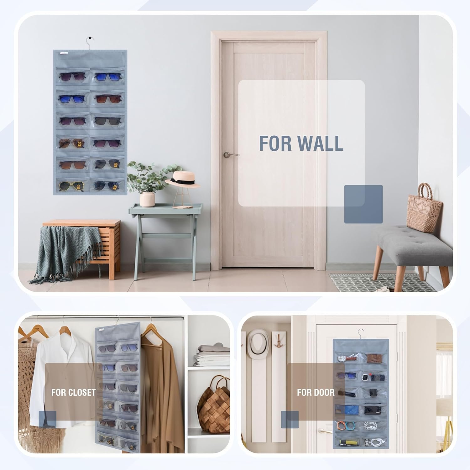 FAB ELLITE Sunglasses Organizer Storage Hanging Dust Proof Sunglasses Case Wall Mounted, Travel Dual Sided Glasses Case Multiple Pairs,Eyeglasses Holder with 24 Clear Slots, Inside; Professional, Grey
