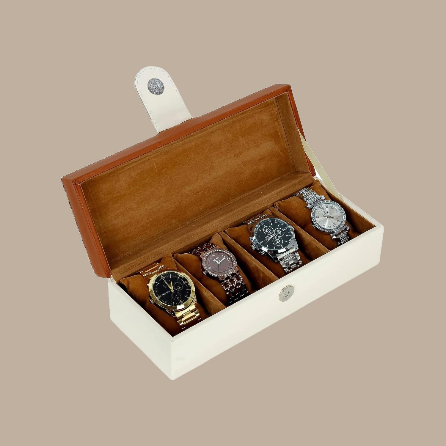 Fly Fashion Vegan Leather Watch Box Organizer 4 Slot Watch Storage Holder Jewelry Case Gifts for Men and Women – Tan