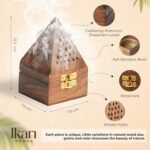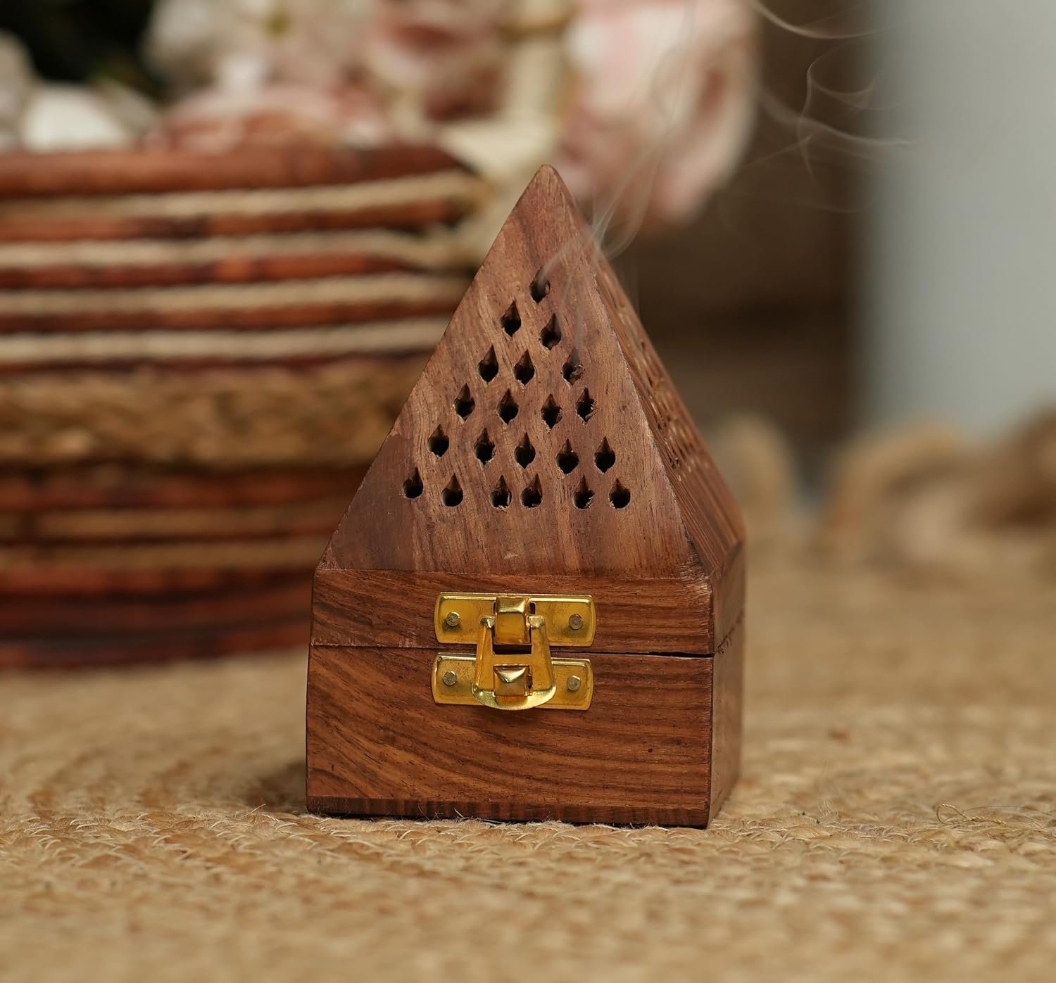 HANDCRAFTED DESIGN: Beautiful wooden incense cone holder made from premium Sheesham wood, featuring intricate lattice pattern on the pyramid-shaped lid