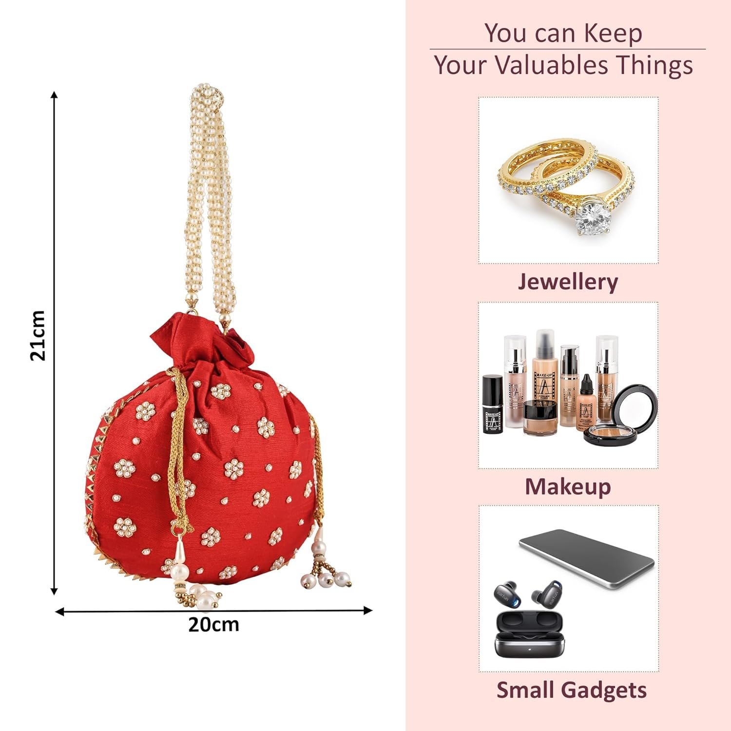 ✅ Package Contains – 1 Piece Potli Bags/Pouches for Women | Color – Moti Design – Pink | Material – Polyester | Product Dimensions – 20x1x21 cm