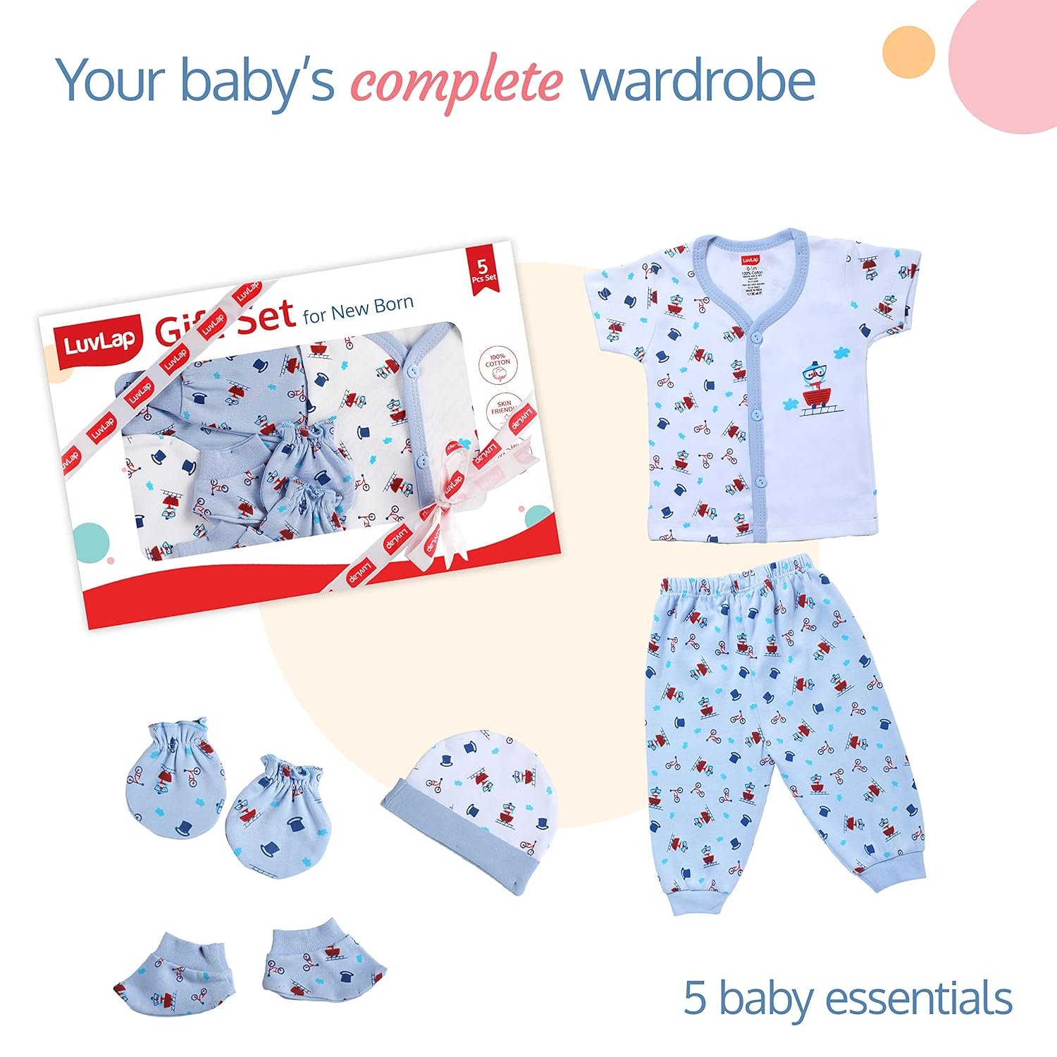 LuvLap Newborn Baby Gift Set of 5 Items, Open Half Sleeves Jhabla Vest- Tshirt, Pajama Pants, Cap, Mittens and Socks, Cottony Soft, Skin Friendly, Baby Clothes Set 0-3 Months, White Boat Hats Print