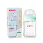 Pigeon Glass Natural bottle with the Natural Response nipple lets baby control the pace of the milk, like they do when breastfeeding. The nipples’ unique opening and tip only releases milk when your baby actively drinks. When pausing to swallow and breathe no milk flows. Baby can drink, swallow, and breathe using their natural rhythm, just like they do when breastfeeding. Easily combine breast and bottle feeding with a wide breast-shaped nipple with a soft feel that mimics the shape and feel of a breast; plus baby controlling the flow of milk like they do when breastfeeding. The nipple has a no-drip design which helps prevent lost milk from the tip. An anti-colic valve integrated into the nipple is designed to reduce colic and discomfort by sending air away from your baby’s tummy. The ergonomic shape makes it comfortable for parents to hold. Assembly is simple with only a few parts and the wide bottle neck makes filling and cleaning easy. This Natural Pigeon bottle is made of premium quality borosilicate glass, a BPA free material. It is heat and thermal shock resistant, so it can be safely stored in the fridge, warmed and is easy to wash and sterilize. The Natural response nipples come in flow rates 1-5. Use the Pigeon Natural baby bottle with Pigeon Natural bottle nipples. Includes: Glass Natural bottle with Natural Response nipple flow What to expect when introducing the Pigeon Natural Response Nipple It is totally natural for your baby to take 2-3 tries to get milk flowing from a new bottle. Unlike traditional bottles the Natural bottle is designed to only release milk when your baby is actively drinking, like what happens when babies breastfeed. We have 4 different nipple flow rates for the Natural bottle. When looking for the right nipple flow rate, age is a guide, but your baby’s approach to drinking and the feeding cues they will show will help determine when to move to a higher or lower nipple flow rate.