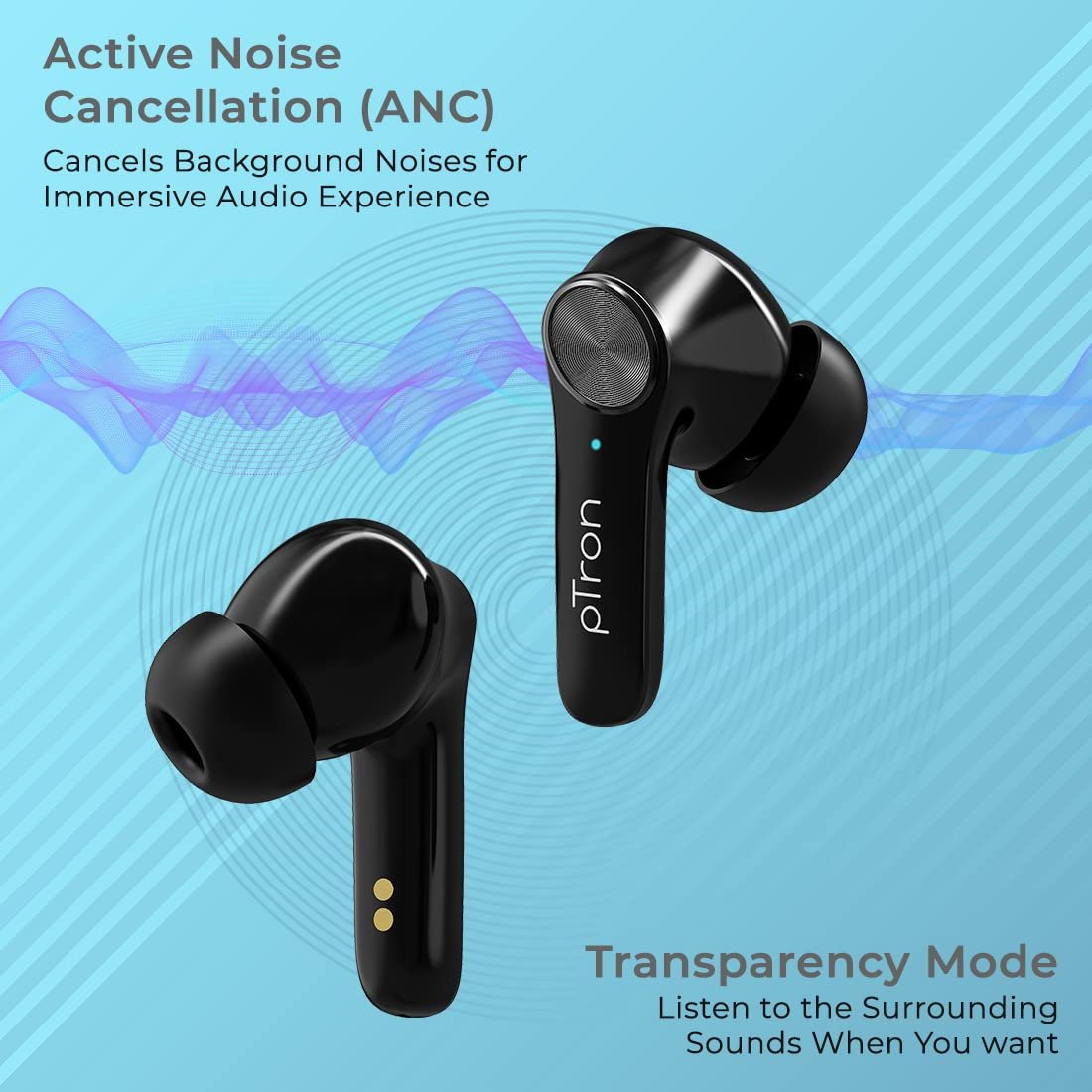 pTron Basspods P481 Pro Active Noise Cancellation in-Ear TWS Earbuds, Transparency/Game Mode, Deep Bass, Touch Control, Bluetooth v5.1 Headphones with Mic, Type-C Fast Charge & IPX4 (Jet Black)