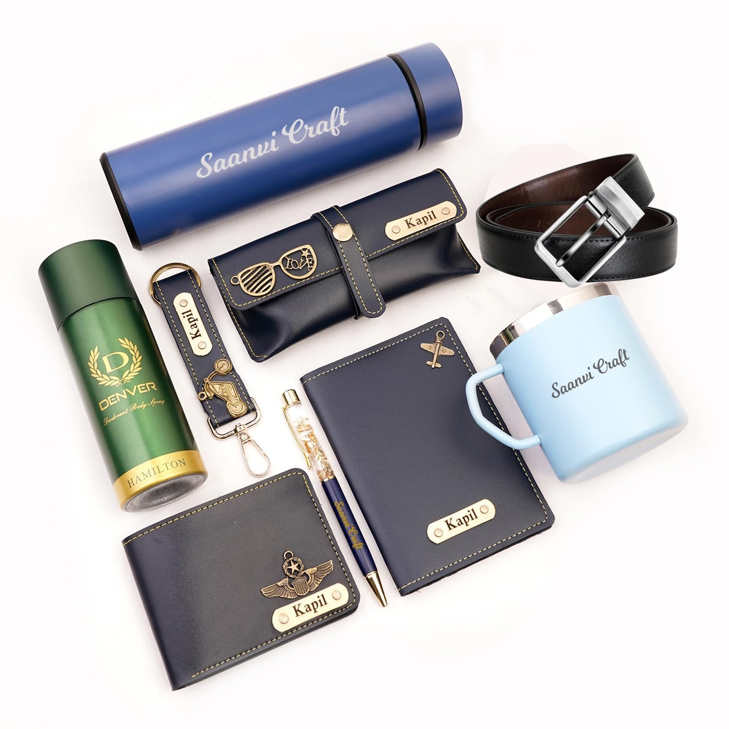Saanvi Crafts Your Name Customized Mens Gift Hamper Set With Water Bottle, Passport Cover, Pen, Men Wallet, Sunglasses Cover, Keychain, Men Deodorant, Golden Rose With Coffee Mug and Belt (Blue)