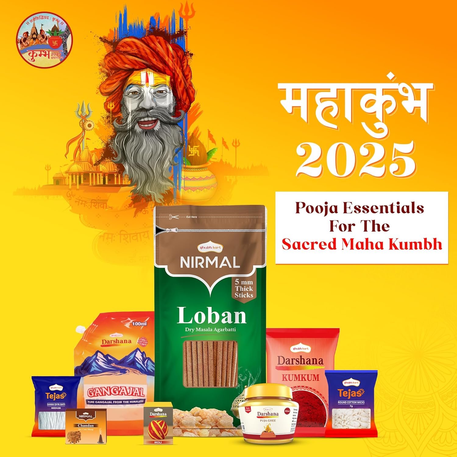 Shubhkart Maha Kumbh Pooja Samagri Kit | Loban Dry Masala Zipper Agarbatti | Chandan Dhoop Cone | Moli Roll | Kumkum Powder | Gangajal | Cotton Wicks | 200ml Puja Ghee (Pack of 8)