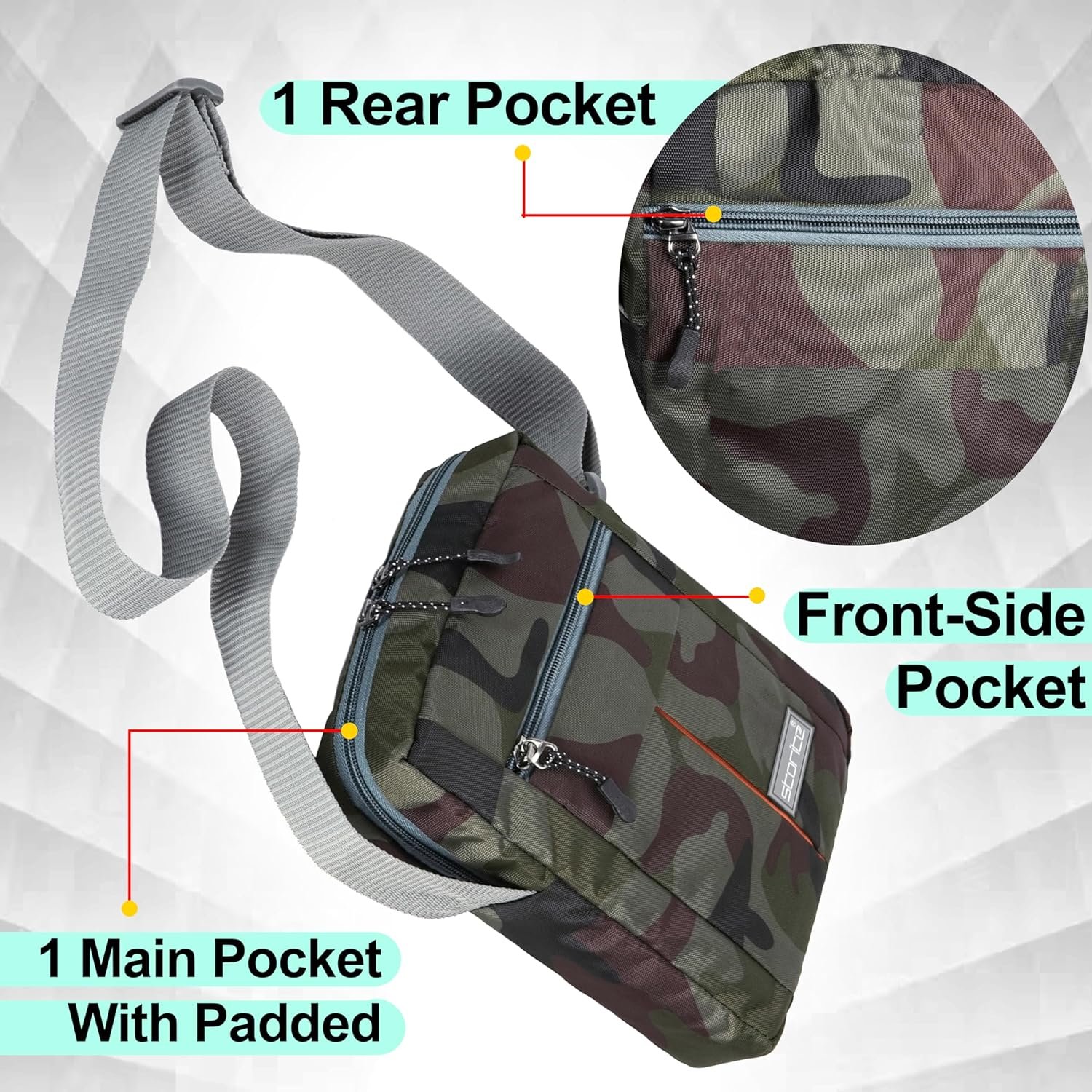 Small Army Print Padded Nylon Cross Body Sling bag Office Travel One Side Shoulder Bag for Men Women (25x19x7cm) (GreenGrey), Grey, 1 Pack, Sling Bag