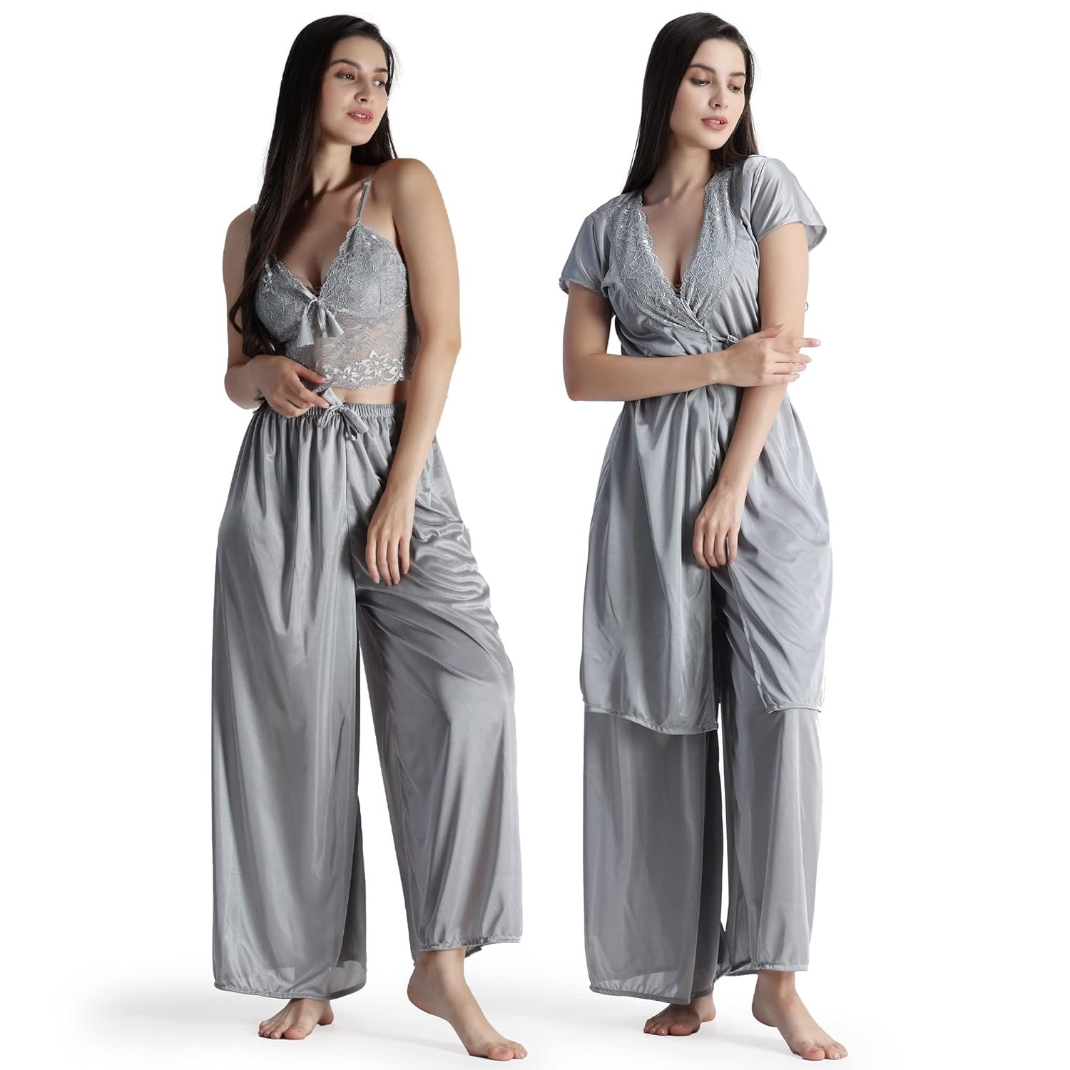 SSoShHub Women’s Satin Kimono Robes Bridesmaid Wedding Robes Silky Bathrobes Summer Loungewear Nightsuit Nighty Honeymoon Grey Special 3 Piece set