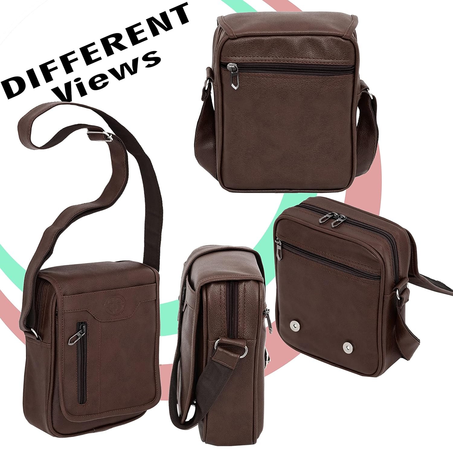 Crossbody bag Structure : Dark Brown flap With Buckle Closure. 1 zipper pocket in the back. 1 Front Zipper Pocket. Interior: 1 main compartment with 1 Security zipper Pocket, 1 Padded pocket for Tablet
