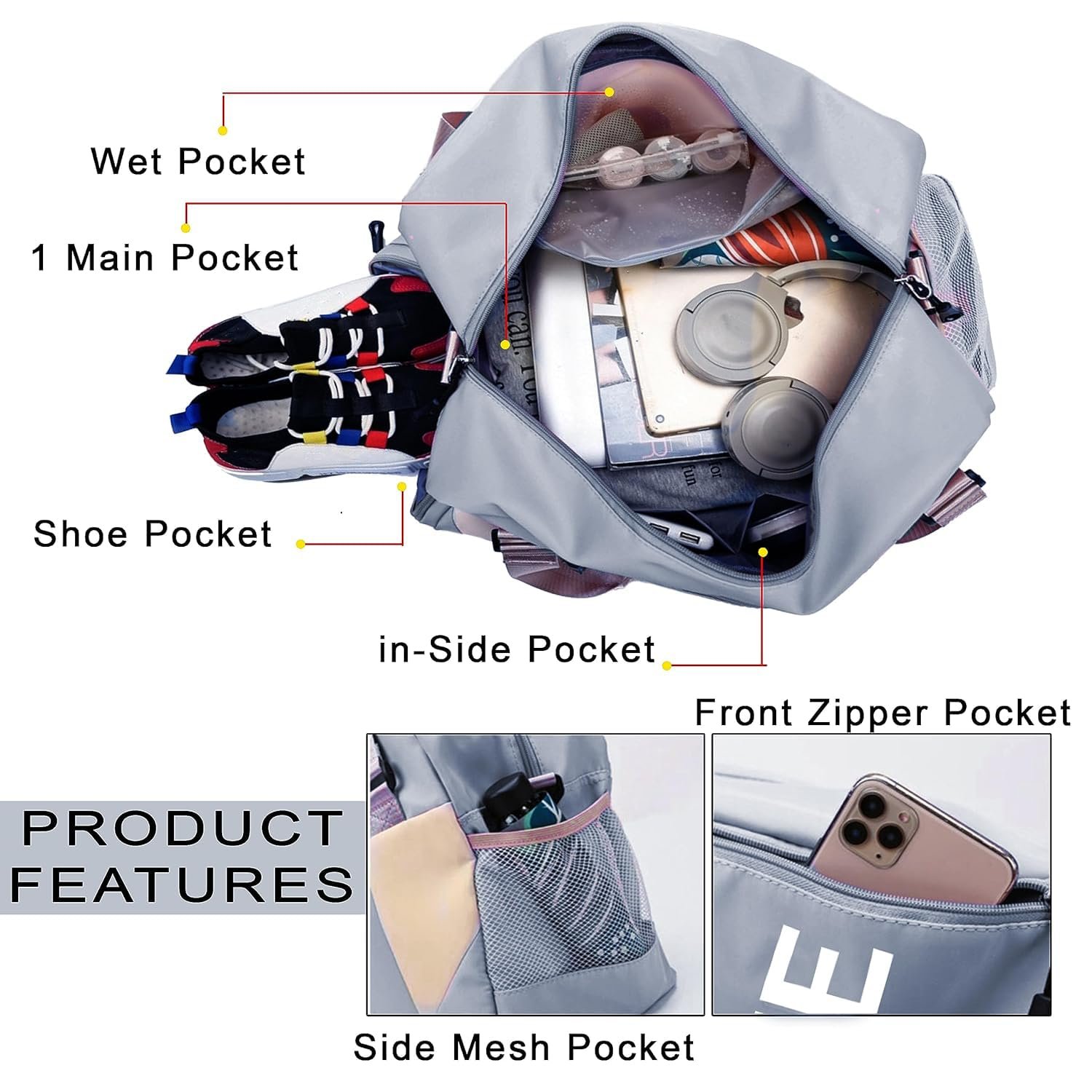 No of Compartments : 1 Main compartment + 1 small wet pocket + 2 inside Card pocket + 1 Shoe Compartment & front zipper & Side mesh Pocket.