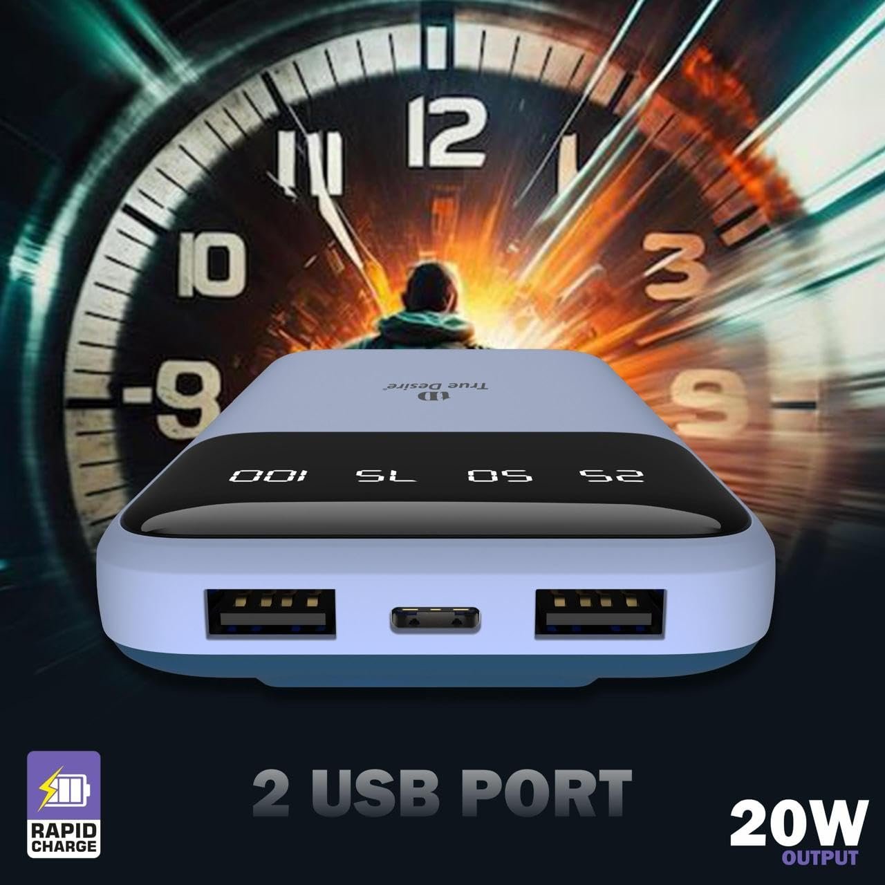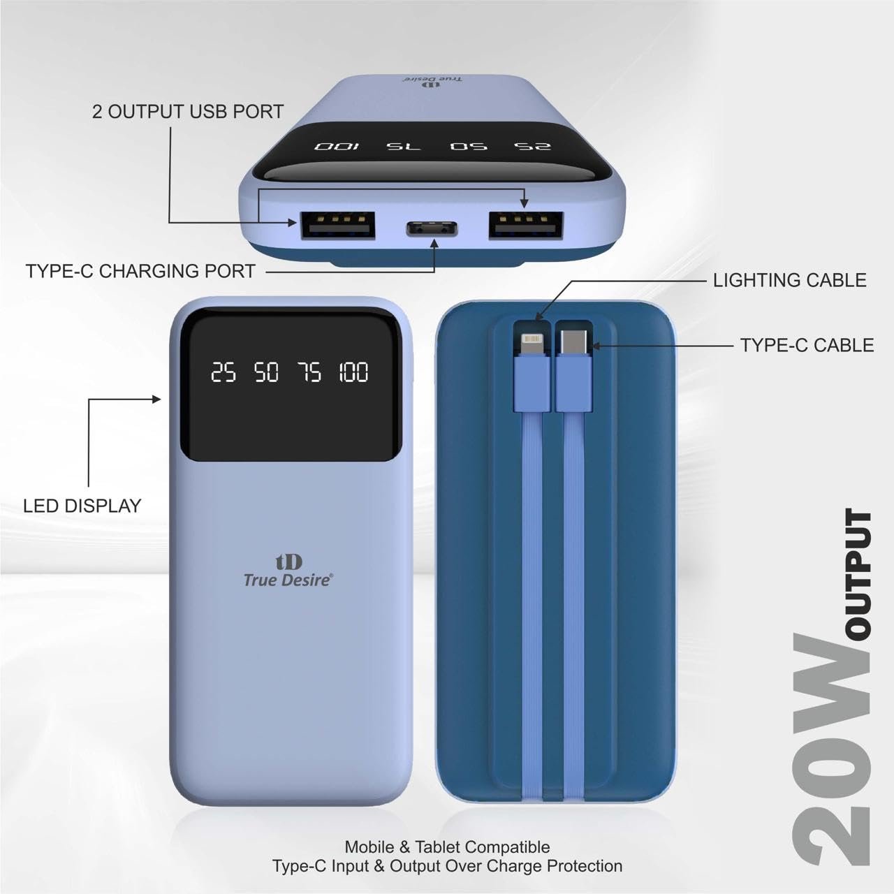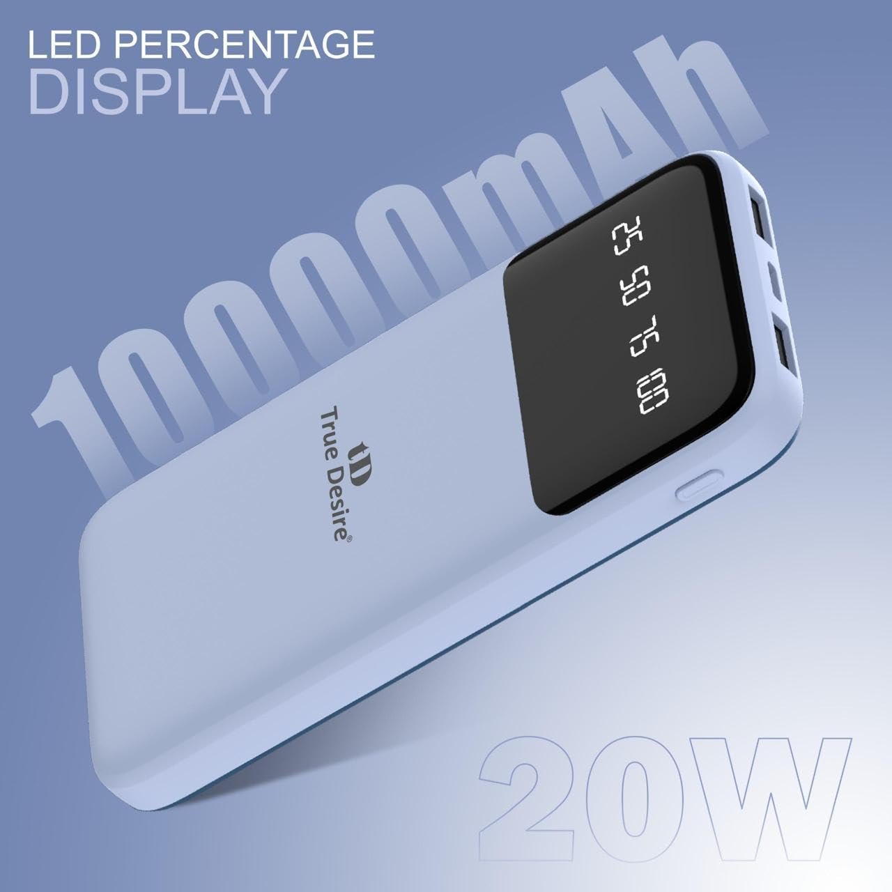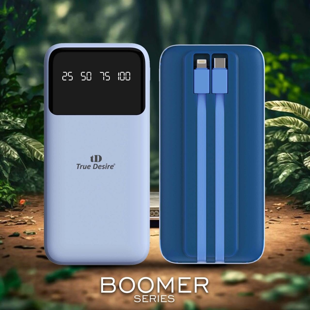 TD True Desire Boomer Series 10000mAh Power Bank – 20W Fast Charging, Dual USB & Type-C Outputs, Inbuilt Lightning & Type-C Cables, LED Indicator- Made in India (Blue)