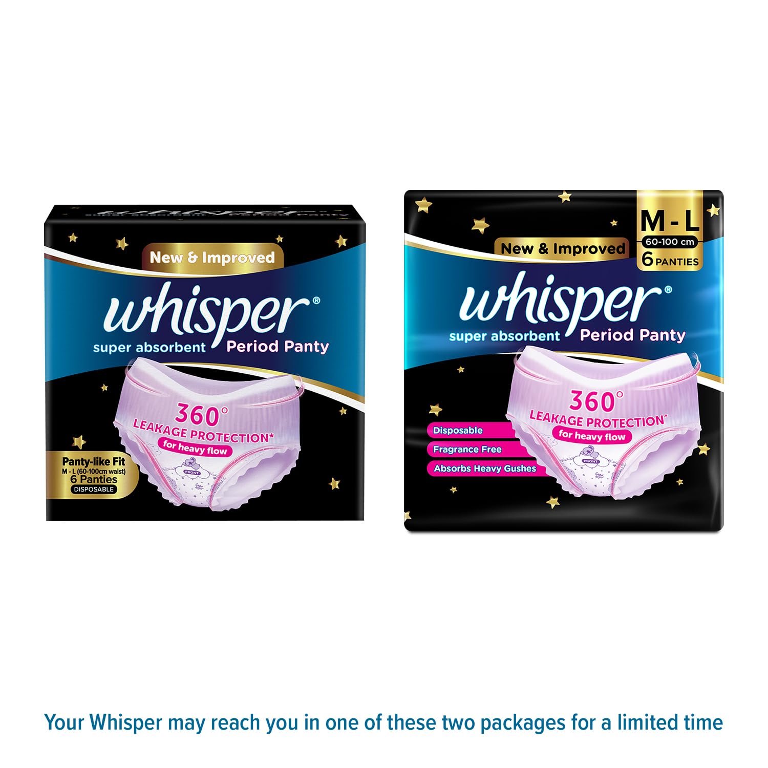 Whisper Super Absorbent Period Panty, 6 M-L Pants, 360 Degree Leakage Protection for Heavy Flow, Panty like Fit for Full back Coverage, Absorbs Heavy Gushes, Silky Soft, Comfortable Feel