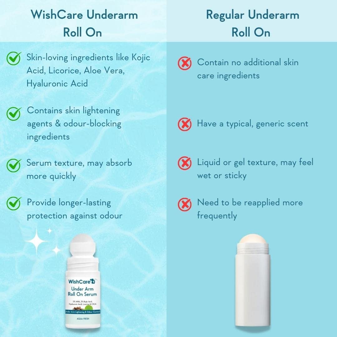 WishCare Underarm Roll On Serum – 5% AHA & 3% Kojic Acid for Brightening & Odour Control – Roll On Deo for Women & Men- Long Lasting Aqua Fragrance – 50ml